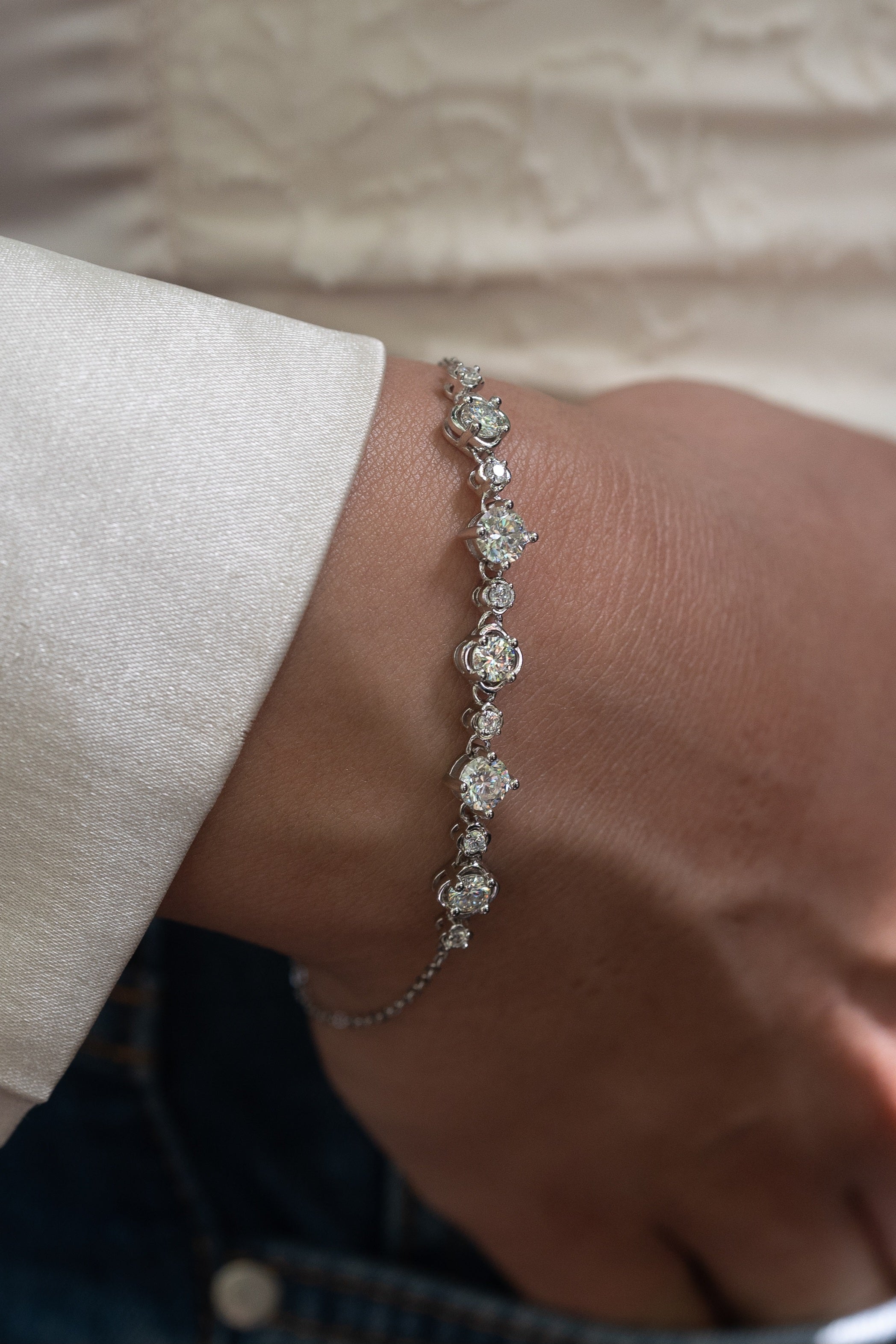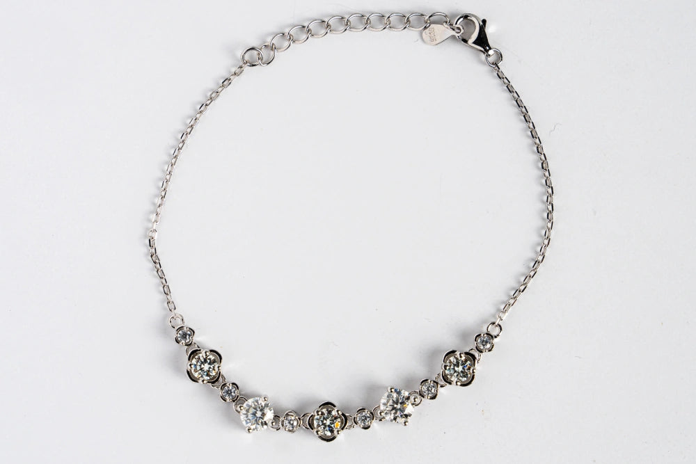 Inspired by the delicate beauty of blooming flowers, the "Enchanted Embrace" bracelet captures the essence of nature’s elegance. The intricate design features finely crafted moissanite stones, each one symbolizing the purest form of love and commitment. Perfect for special occasions like anniversaries, weddings, or intimate celebrations, this bracelet is more than just an accessory; it’s a testament to the enchanting moments that make life beautiful. Wear it to add a touch of grace and charm to your most treasured occasions, and let its sparkle be a reminder of the precious bonds you cherish.