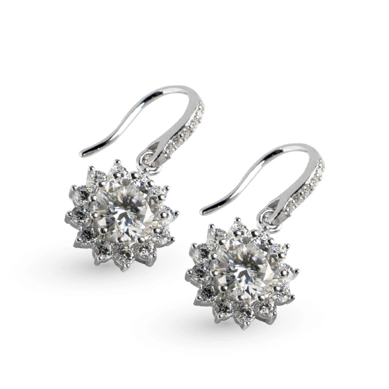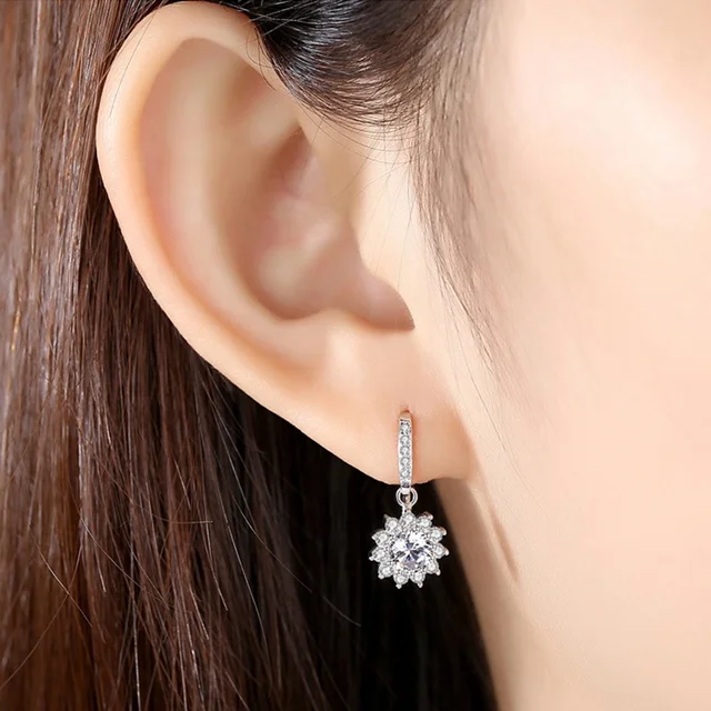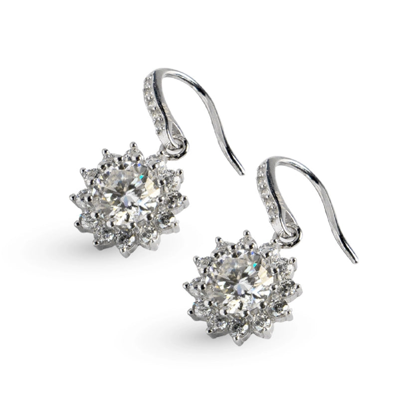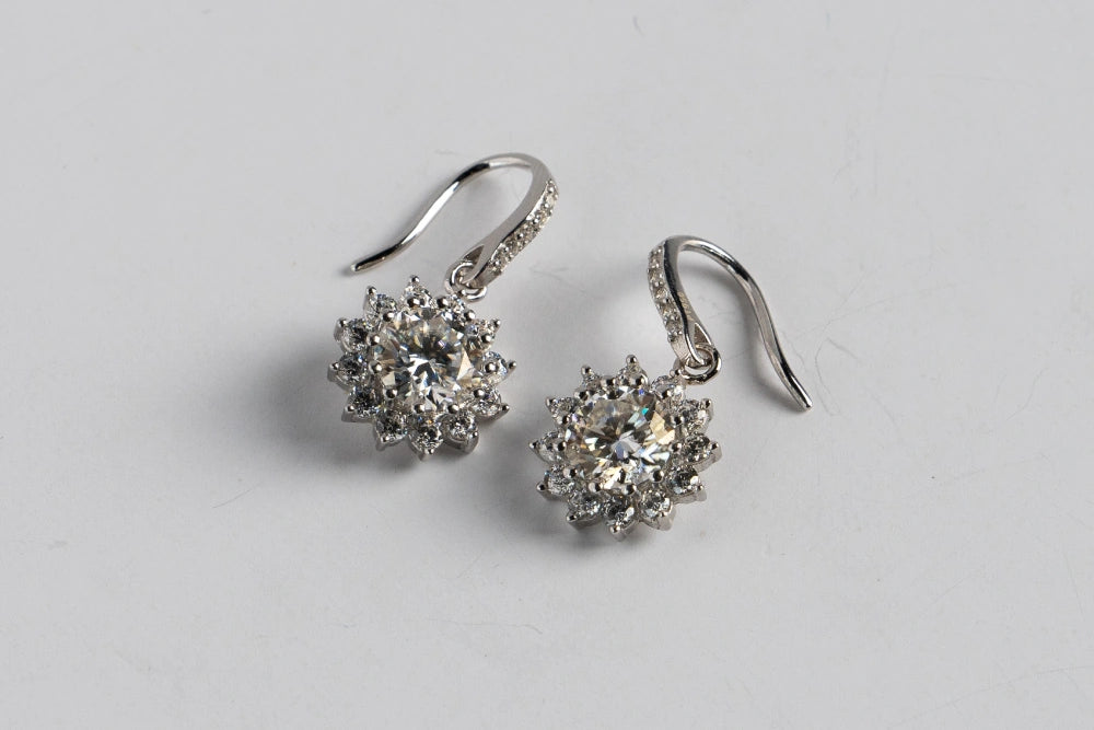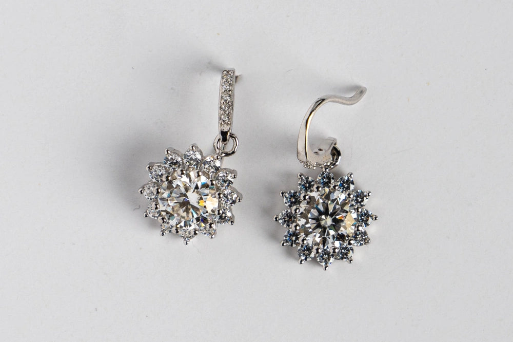 A perfect blend of elegance and brilliance, these earrings capture the mesmerizing beauty of a radiant flame. Inspired by the magic of a sparkling fire, the center moissanite stone is surrounded by a halo of dazzling gems, creating a captivating display of light and brilliance. The delicate hook design ensures a graceful drop, allowing the earrings to sway gently with every movement, catching and reflecting light beautifully. Perfect for special occasions, these earrings add a touch of enchantment and sophistication to any ensemble, making every moment unforgettable. Whether attending a gala, a romantic dinner, or a celebration, the Enchanted Flame earrings will ensure you shine brightly, embodying elegance and charm.