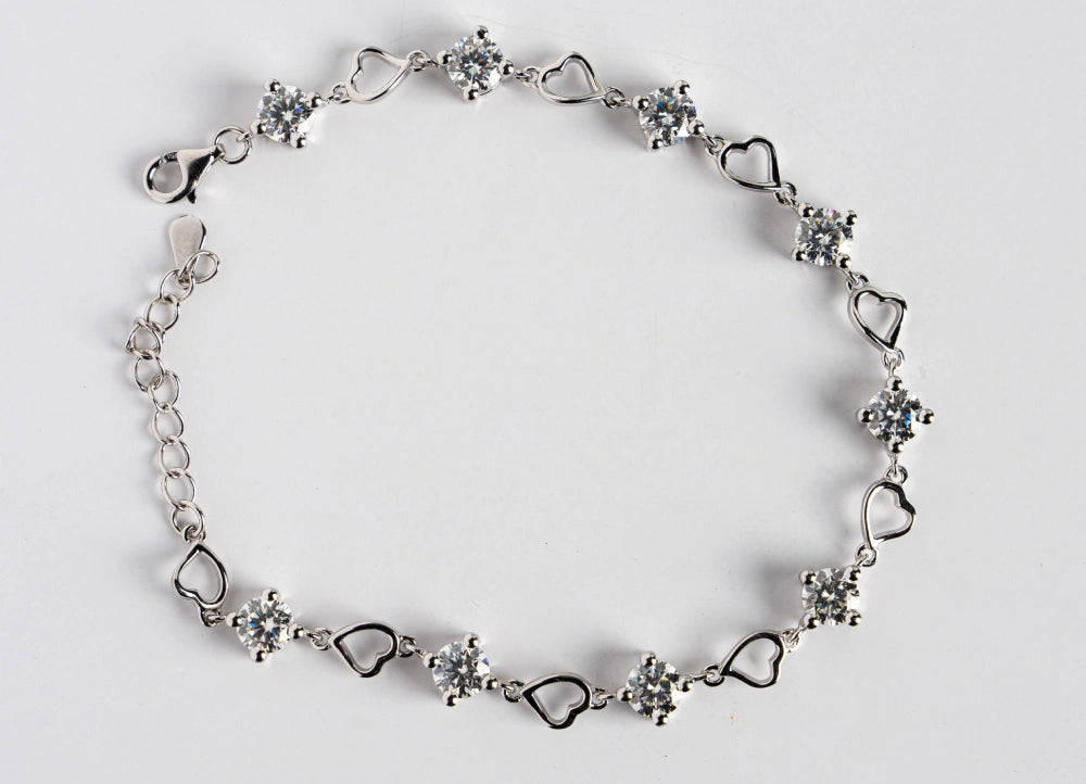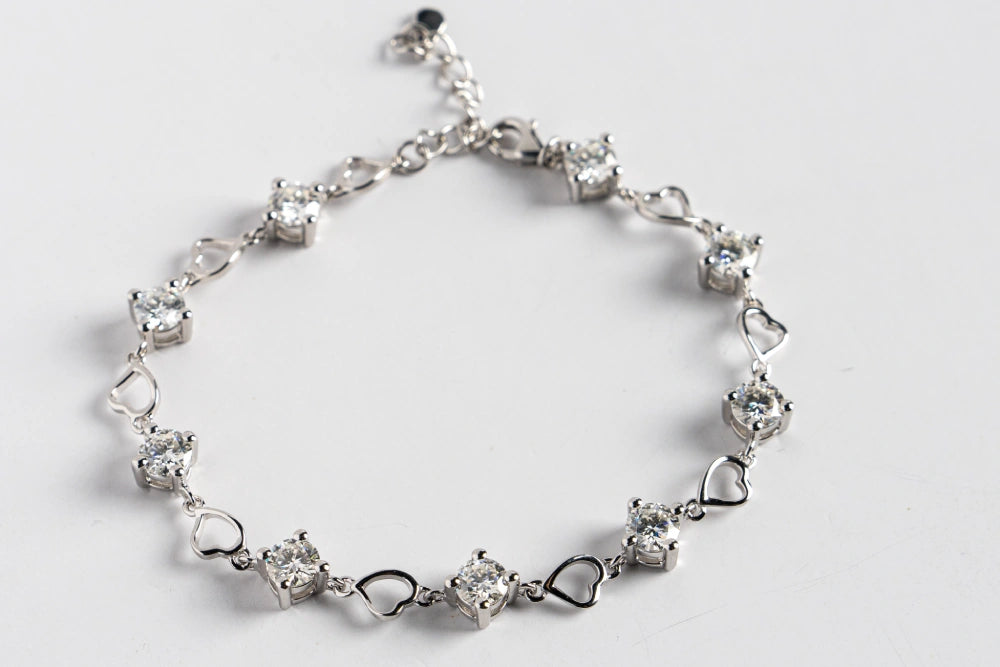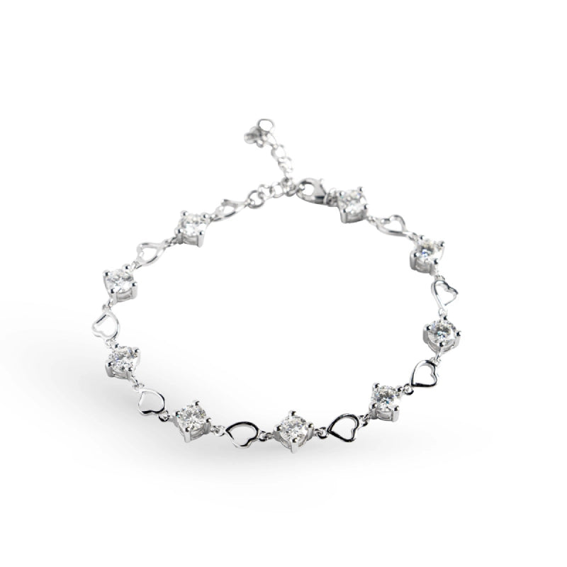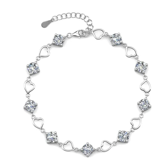 Celebrate the beauty of love with the "Entwined Hearts" bracelet, a timeless symbol of connection and devotion. This exquisite piece features nine radiant moissanite stones, each meticulously set to reflect a heartwarming sparkle. The bracelet's design is inspired by the intertwining of two hearts, representing the eternal bond shared between loved ones. The delicate heart-shaped links add an elegant touch, making it perfect for any occasion. Whether it's a gift for a loved one or a treat for yourself, this bracelet captures the essence of love in its most beautiful form.